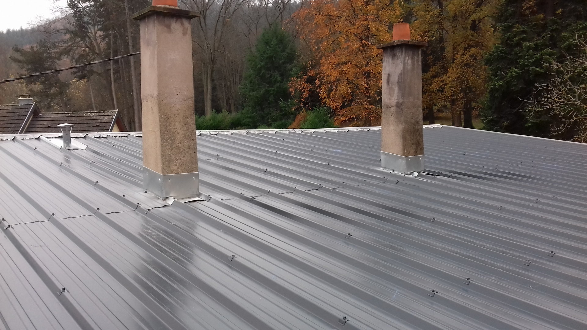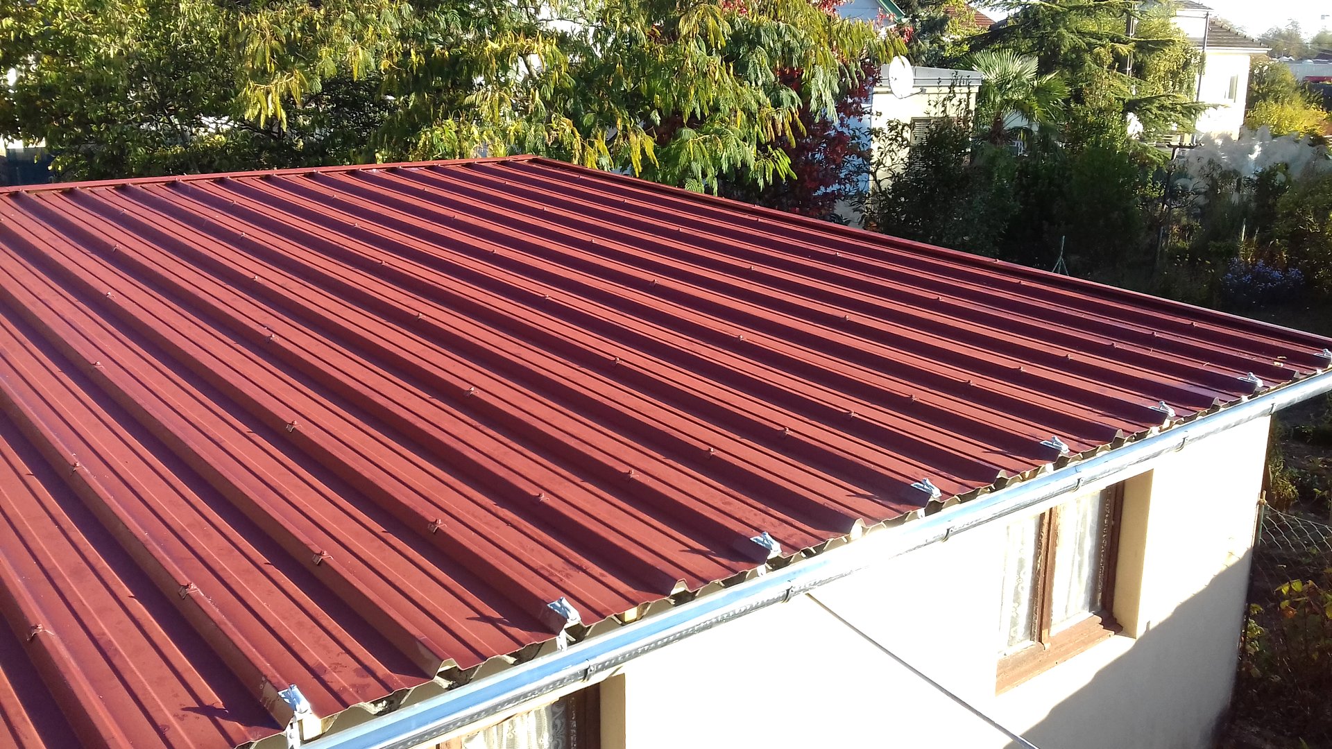 Zinguerie: Gouttières, descentes de gouttières, façonnage et pose sur mesure d’un habillage de conduit de cheminée en tôle laquée, façonnage et pose sur mesure des habillages des joues de lucarnes en tôle laquée, fourniture, façonnage et pose de couvertines en aluminium.