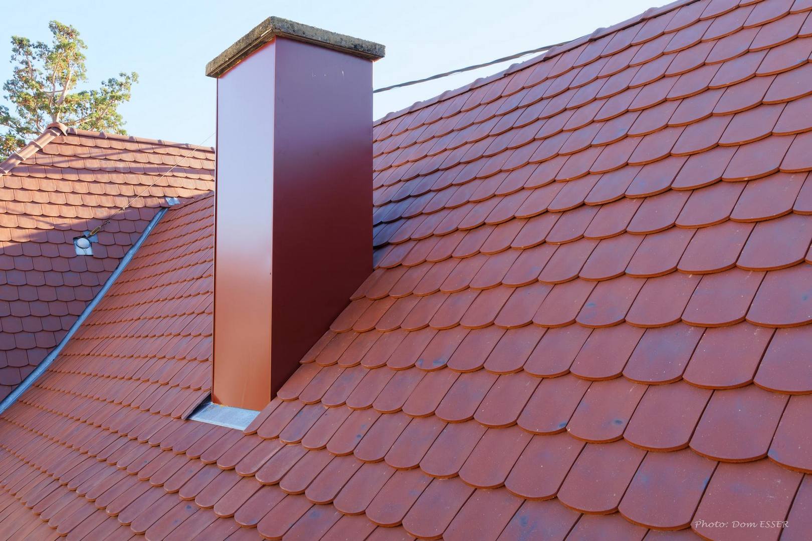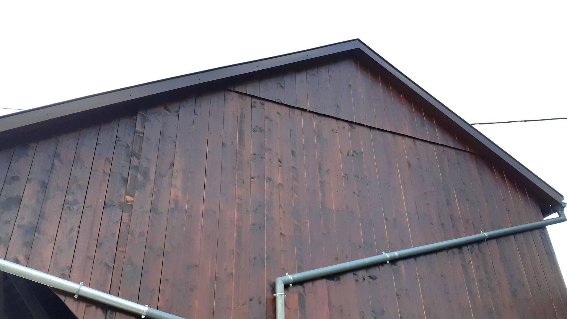 Habillage façonné dans nos ateliers pour les planches de rives ainsi que les planches d’égouts en tôle laquée brun. Habillage sur mesure façonné dans nos ateliers pour le conduit de cheminée en tôle laquée brun.