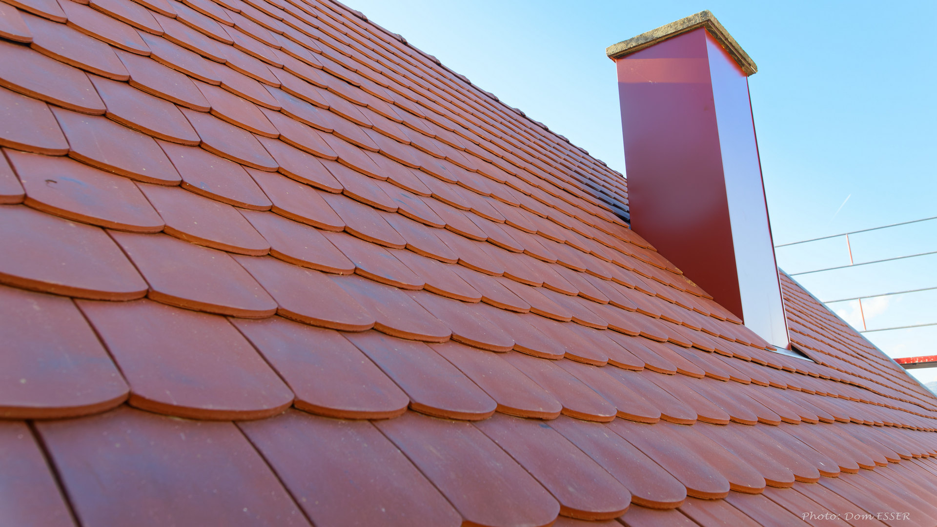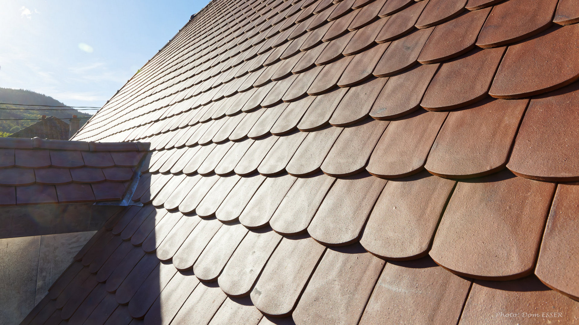 Lattage et contre lattage, sous toiture écran souple respirant, tuiles plates VAUBAN écaille 2 rouge nuagé.